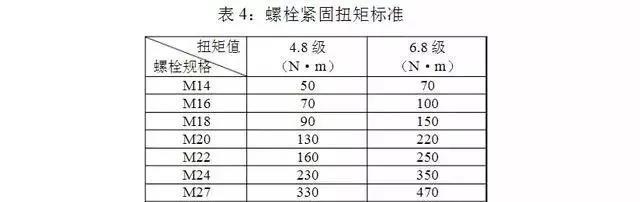 連接螺栓應(yīng)逐個(gè)緊固,螺栓的扭緊力矩不應(yīng)小于表 4 的規(guī)定。若發(fā)現(xiàn)螺桿與螺母的螺紋有滑牙或螺母的棱角磨損以致扳手打滑的,應(yīng)更換螺栓、螺母。